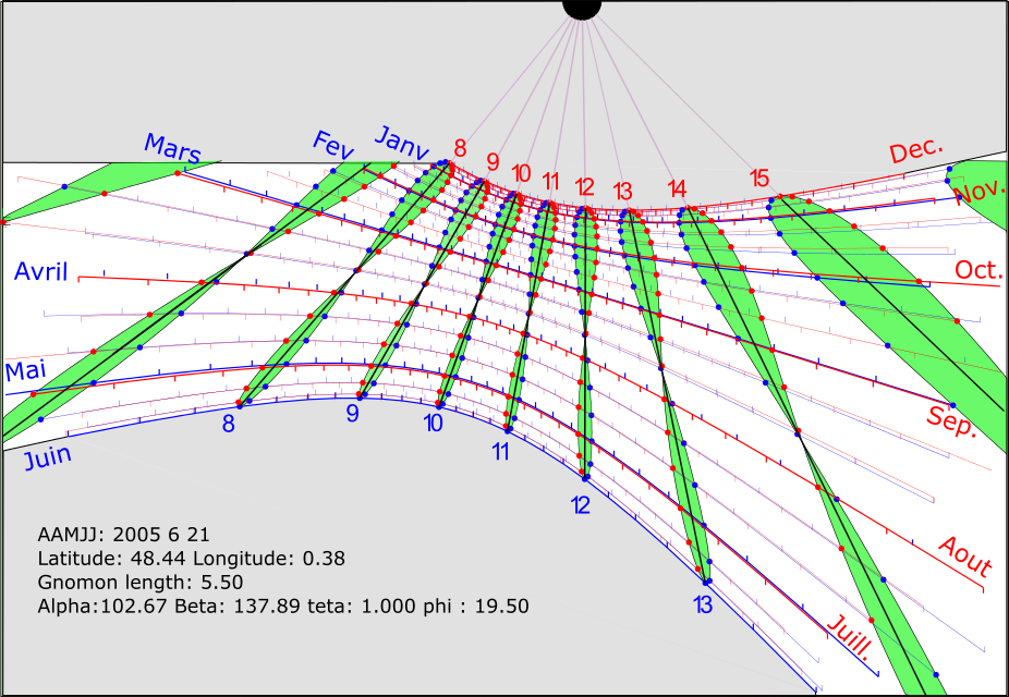 L’exemple ci-contre a été calculé pour un mur légèrement incliné de 1° sur la verticale, et avec un écart au sud de 19.5° vers l'est. Les tailles sont en cm, et les heures en Temps Universel (TU). Les variations sur plusieurs dizaines d’années sont négligeables.